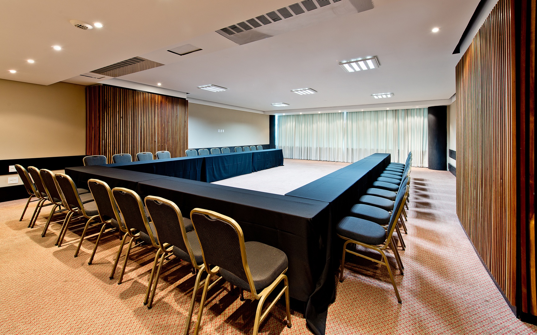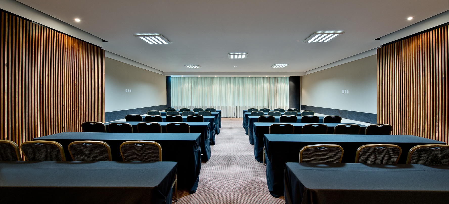 Destinadas a eventos de porte médio, possuem o tamanho ideal para treinamento profissional, realização de painéis e palestras. Assoalho em madeira e cadeiras em couro são o diferencial.